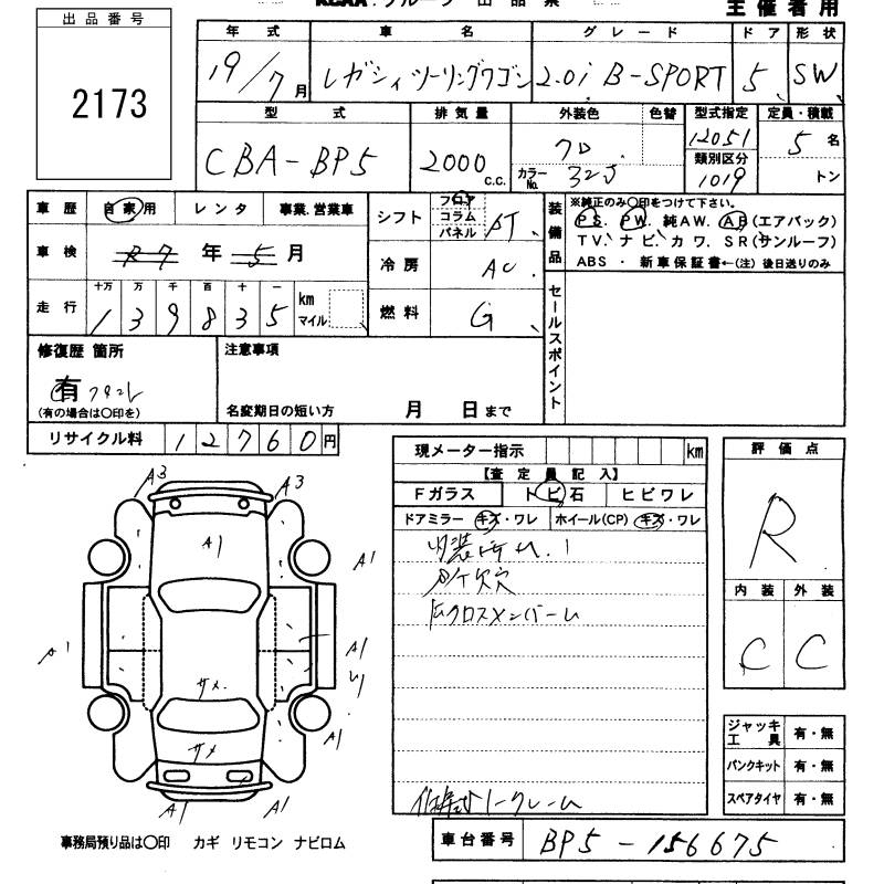 SUBARU LEGACY TOURING WAGON 2.0I B SPORT - лот 2173