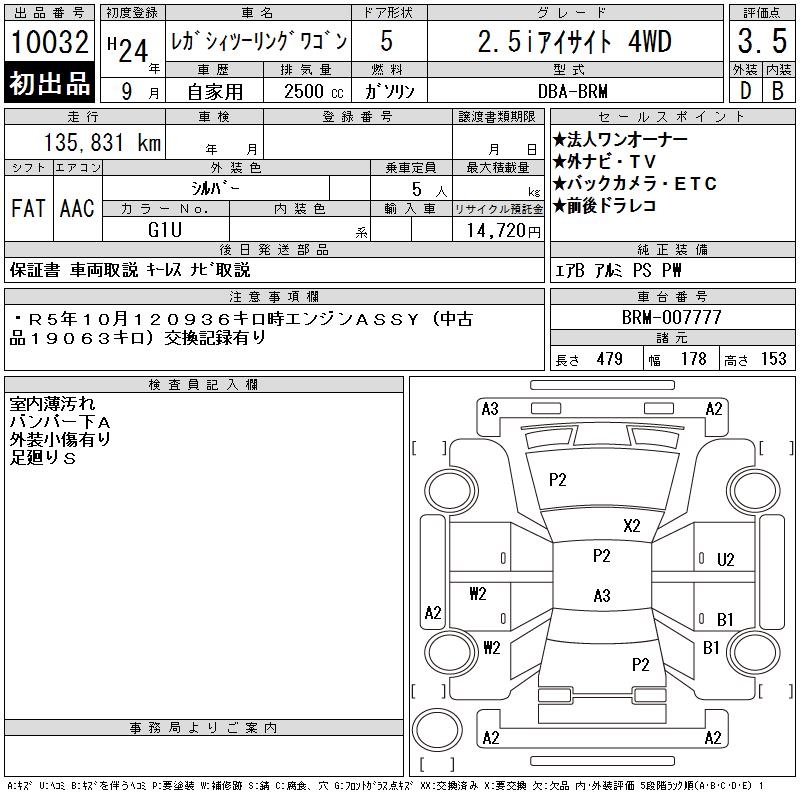 SUBARU LEGACY TOURING WAGON 2.5I EYESIGHT 4WD - лот 10032