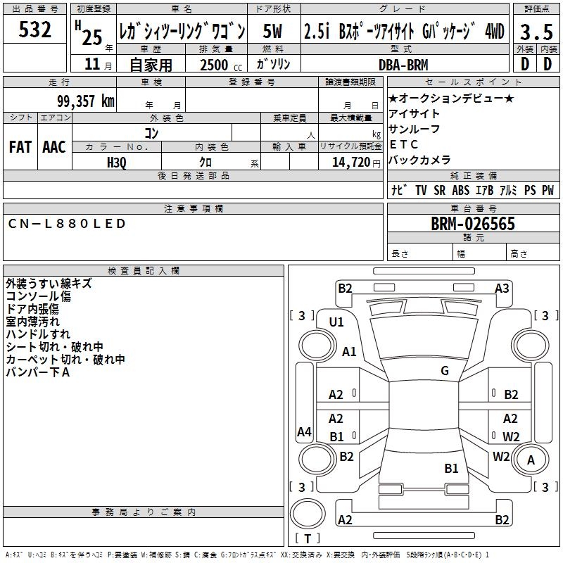 SUBARU LEGACY TOURING WAGON 2.5I B SPORT EYESIGHT 4WD - лот 532