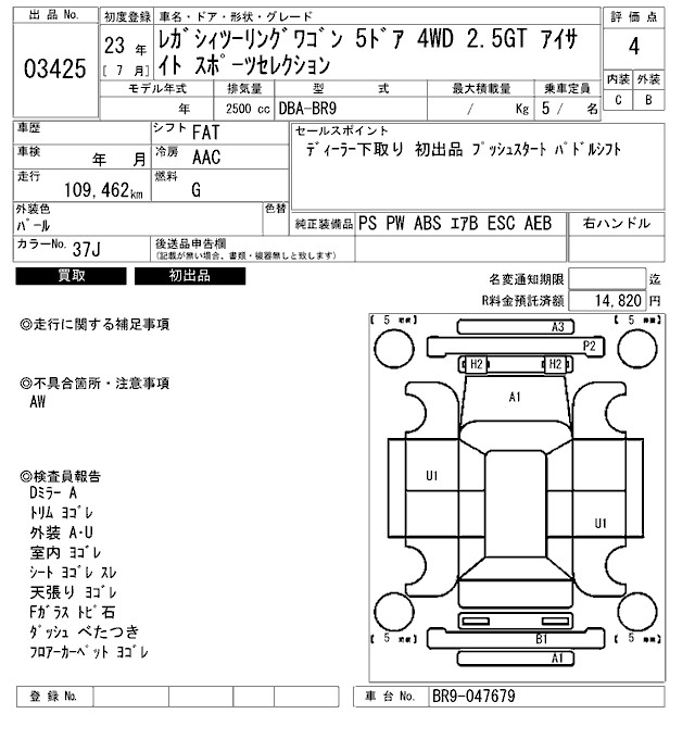 SUBARU LEGACY TOURING WAGON 2.5GT EYESIGHT SPORT SELECTION - лот 3425