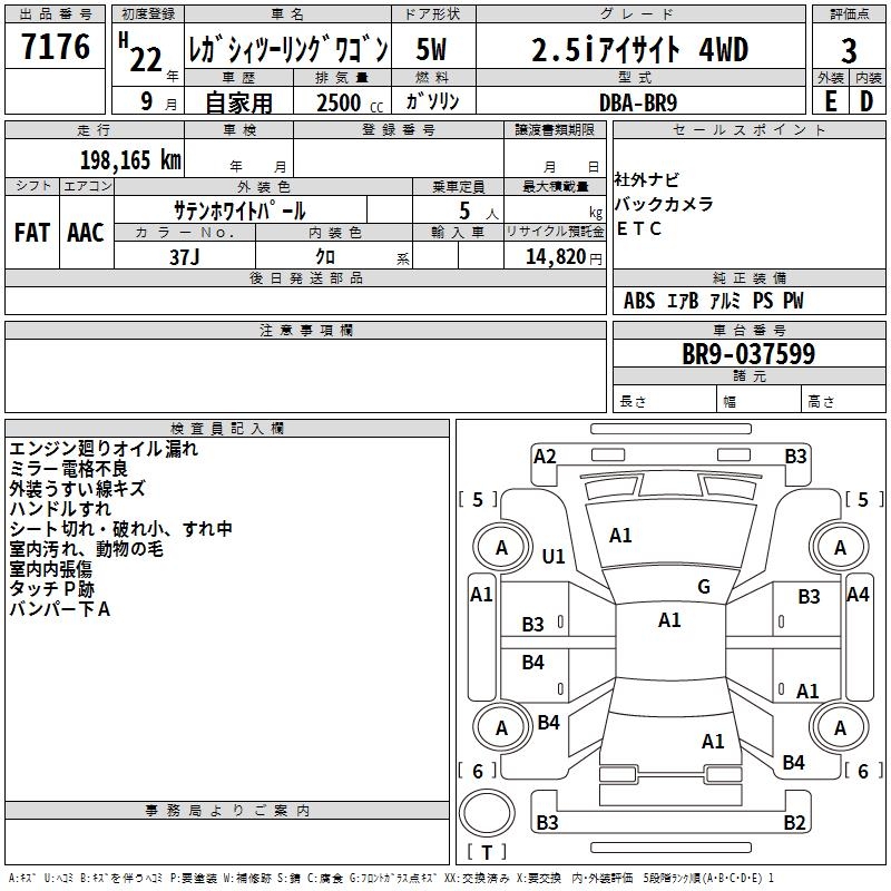 SUBARU LEGACY TOURING WAGON 2.5I EYESIGHT 4WD - лот 7176