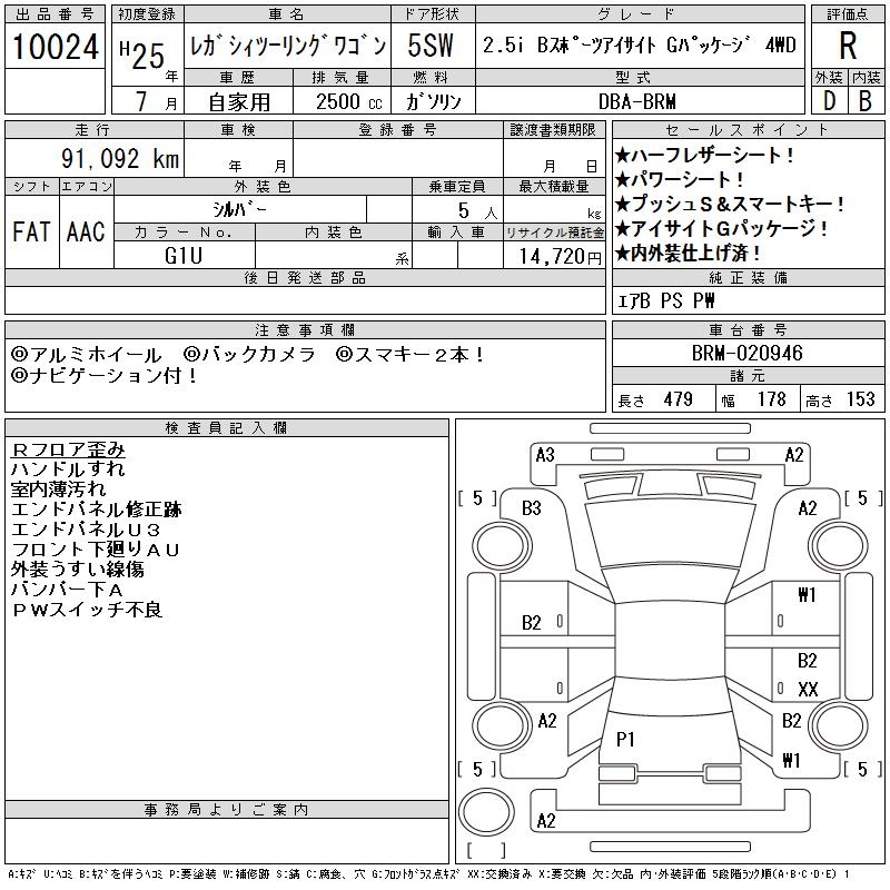 SUBARU LEGACY TOURING WAGON 2.5I B SPORT EYESIGHT 4WD - лот 10024