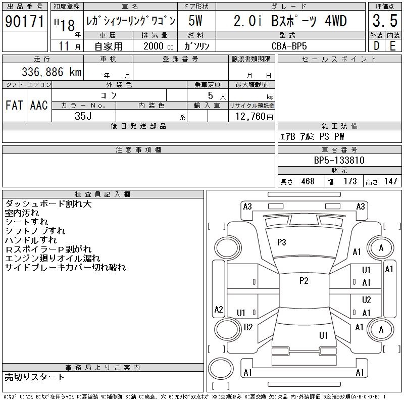 SUBARU LEGACY TOURING WAGON 2.0I B SPORT 4WD - лот 90171