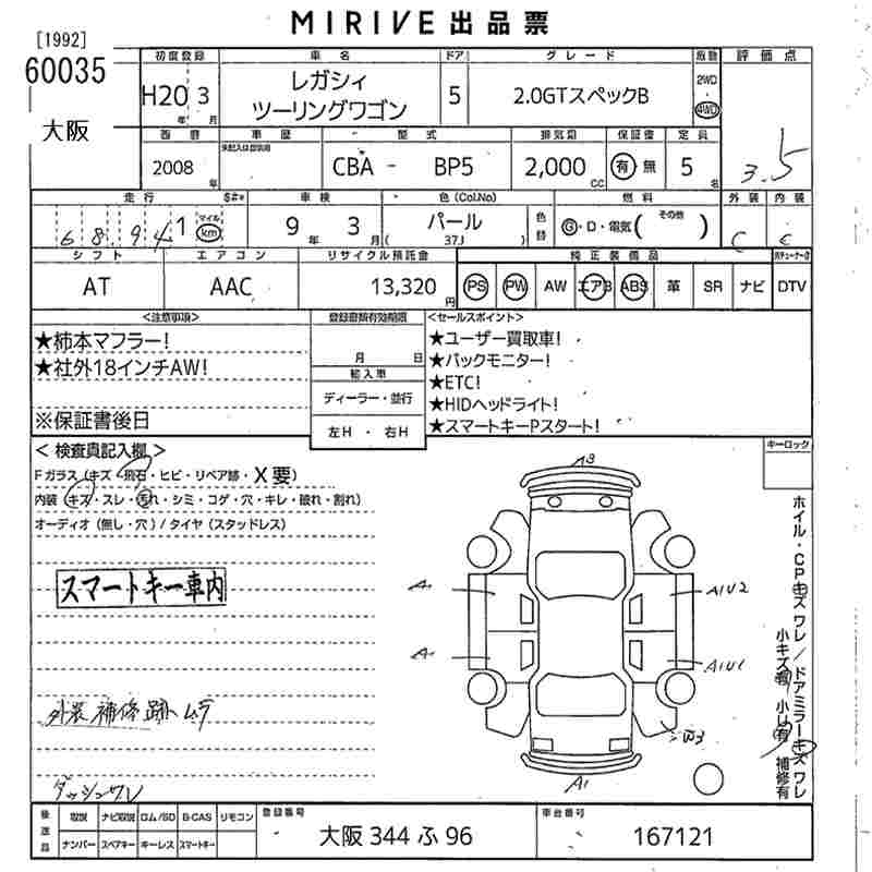 SUBARU LEGACY TOURING WAGON 2.0GT SPECIFICATIONS B 4WD - лот 60035