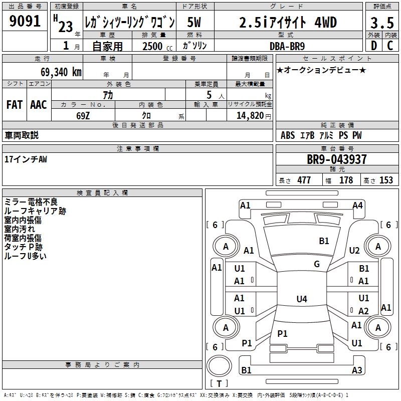 SUBARU LEGACY TOURING WAGON 2.5I EYESIGHT 4WD - лот 9091