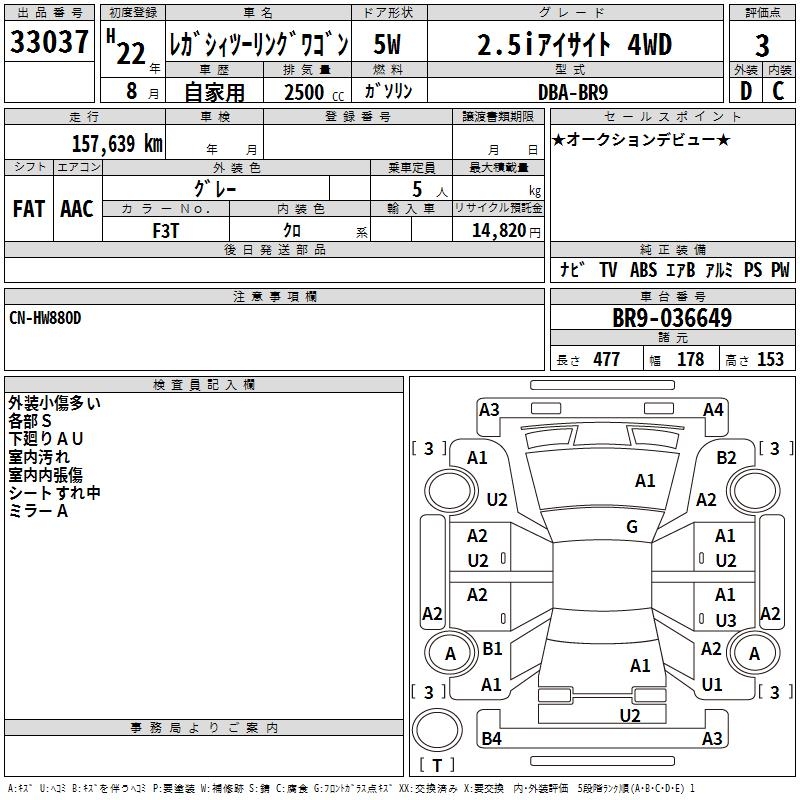 SUBARU LEGACY TOURING WAGON 2.5I EYESIGHT 4WD - лот 33037