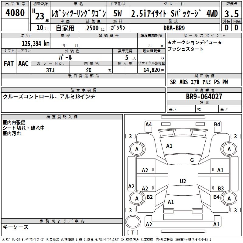 SUBARU LEGACY TOURING WAGON 2.5I EYESIGHT S PACK 4WD - лот 4080