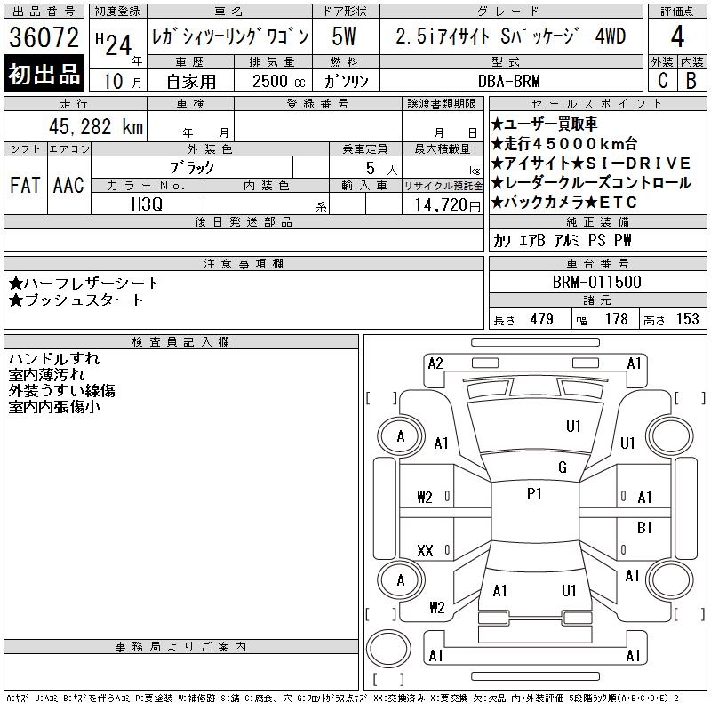 SUBARU LEGACY TOURING WAGON 2.5I EYESIGHT S PACK 4WD - лот 36072