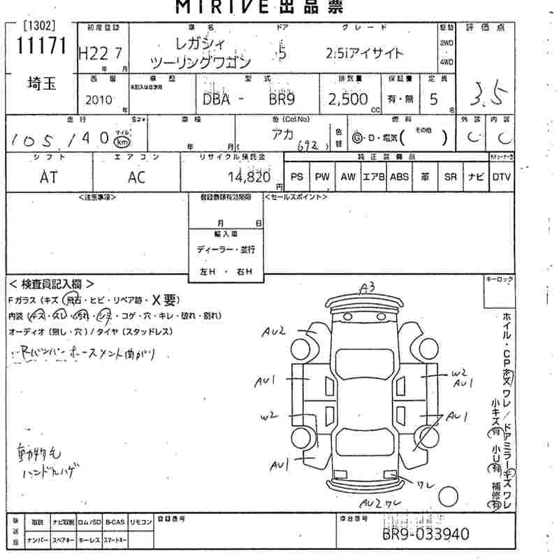 SUBARU LEGACY TOURING WAGON 2.5I EYESIGHT - лот 11171