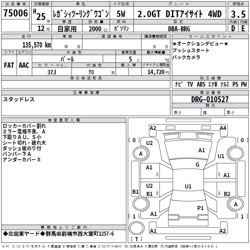 SUBARU LEGACY TOURING WAGON 2.0GT DIT EYESIGHT 4WD - лот 75006