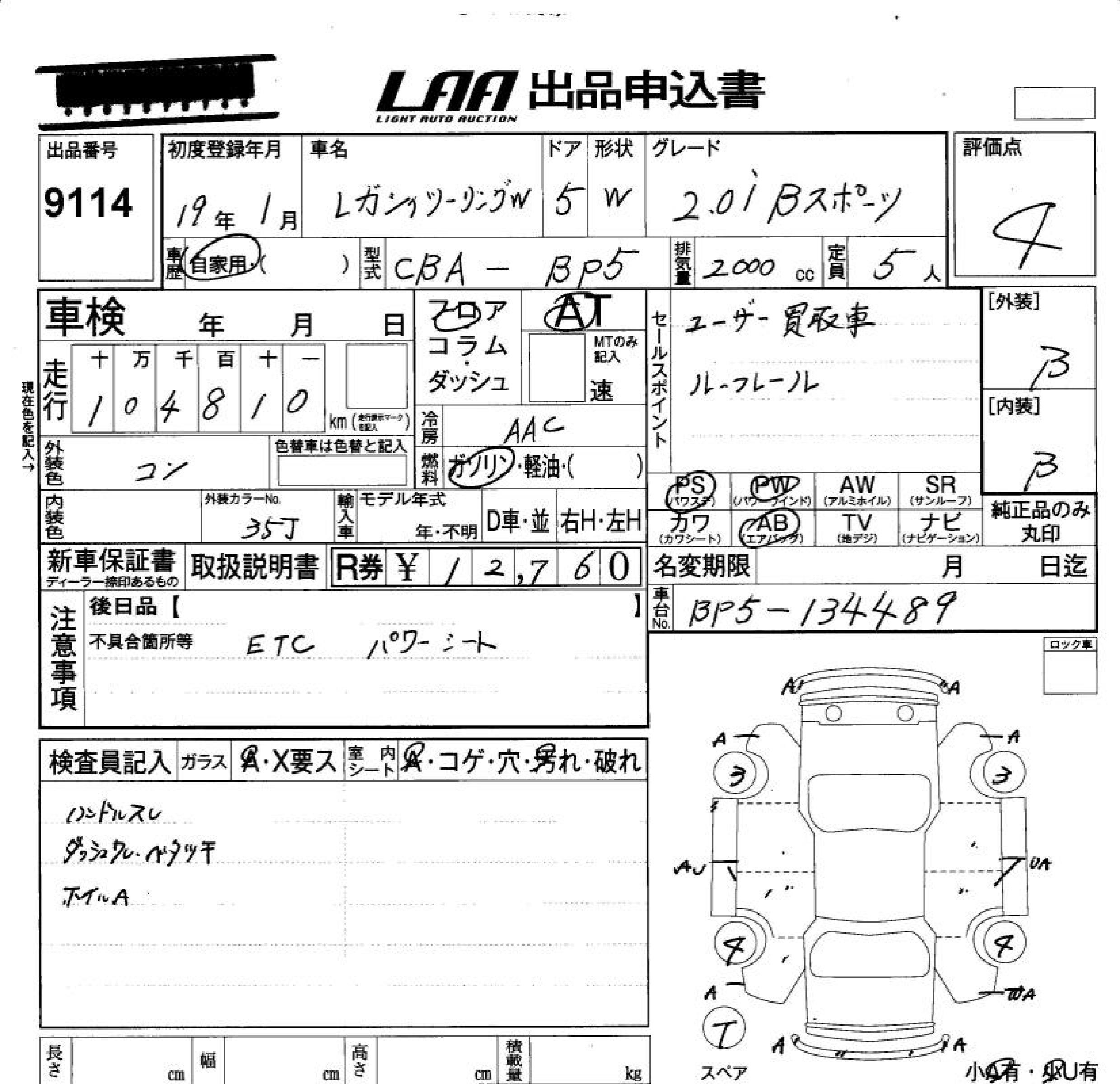 SUBARU LEGACY TOURING WAGON 2.0I B SPORT - лот 9114