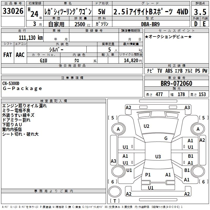 SUBARU LEGACY TOURING WAGON 2.5I EYESIGHT B SPORT 4WD - лот 33026