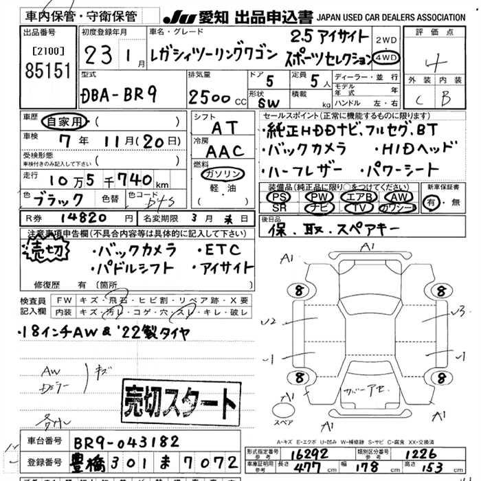 SUBARU LEGACY WAGON 2.5 EYESIGHT SPORT SELECTION 4WD - лот 85151