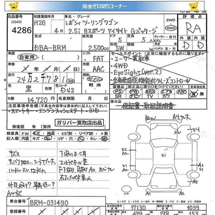 SUBARU LEGACY WAGON 4WD 2.5I B SPORT EYESIGHT G PACKAGE - лот 4286