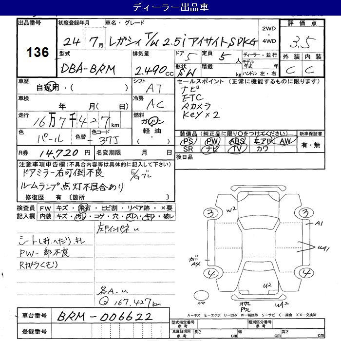 SUBARU LEGACY WAGON 2.5I EYESIGHT S PACKAGE - лот 136