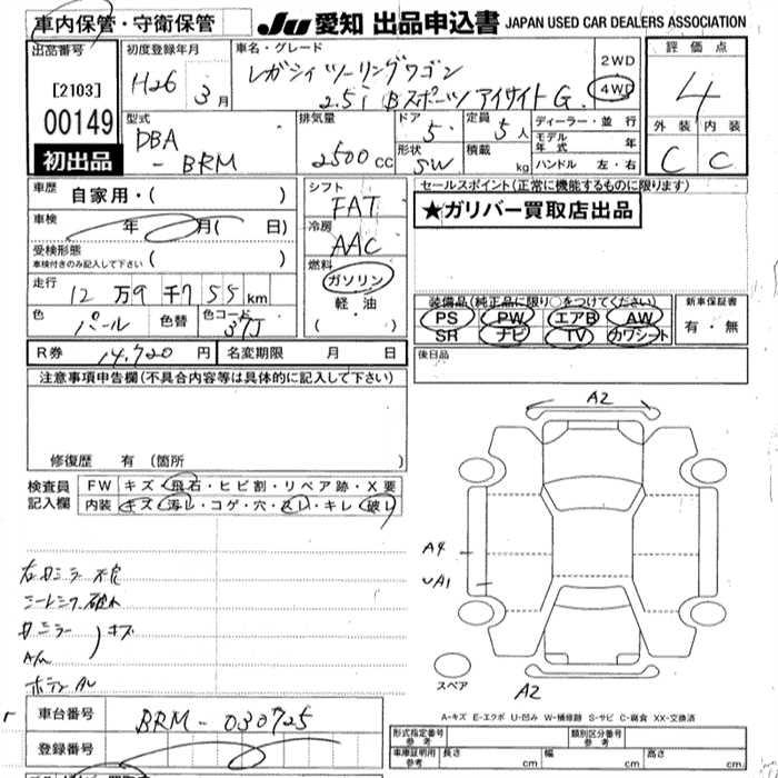 SUBARU LEGACY WAGON 2.5I B SPORT EYESIGHT 4WD - лот 149