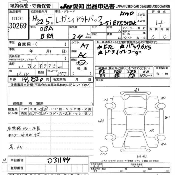 SUBARU LEGACY WAGON 2.5I EYESIGHT 4WD - лот 30269
