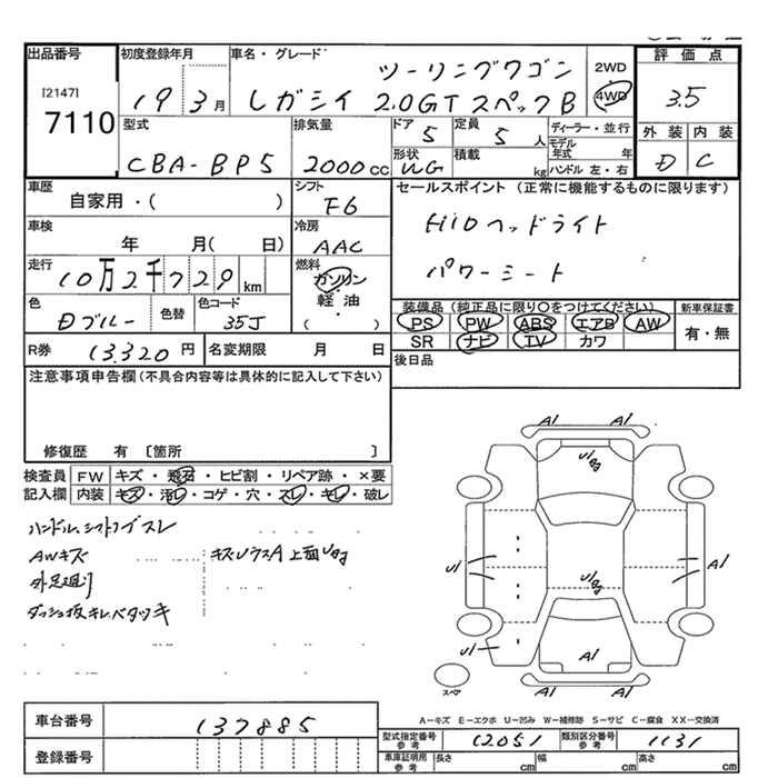 SUBARU LEGACY WAGON 4WD 2.0GT SPECIFICATIONS.B TOURING WAGON - лот 7110
