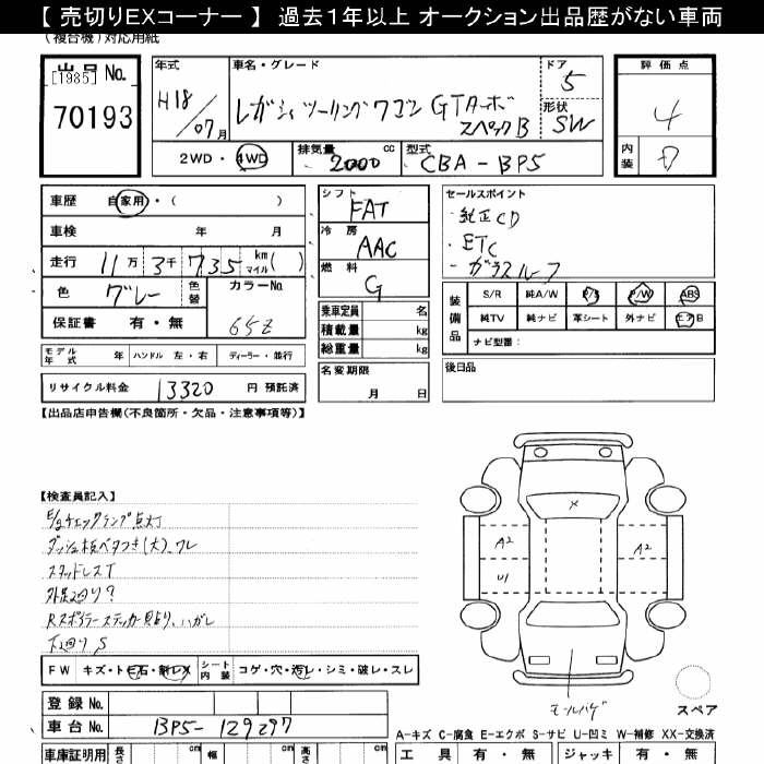 SUBARU LEGACY 4WD GT TURBO SPECIFICATIONS.B - лот 70193