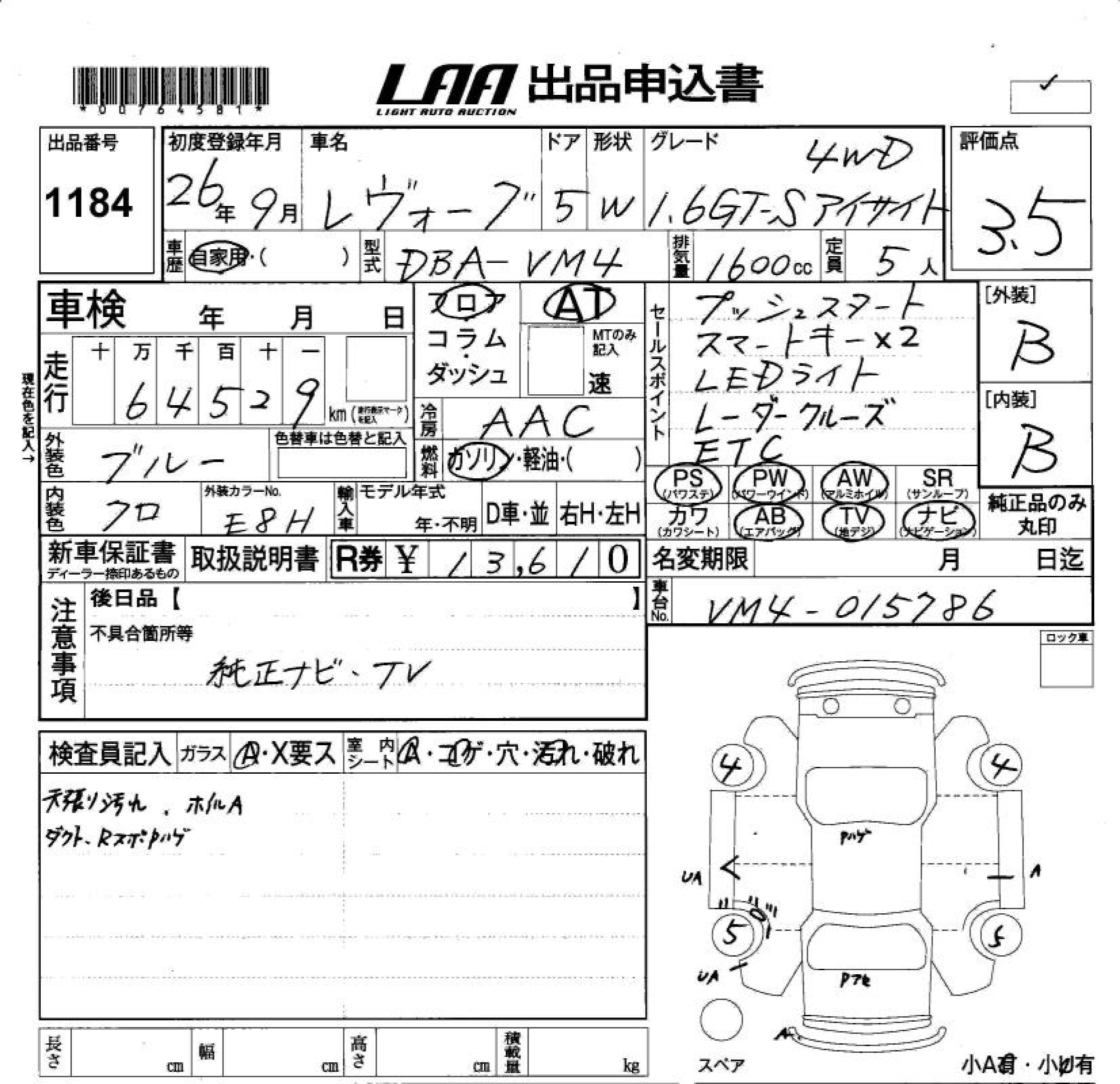 SUBARU LEVORG 1.6GT-S EYESIGHT 4 - лот 1184