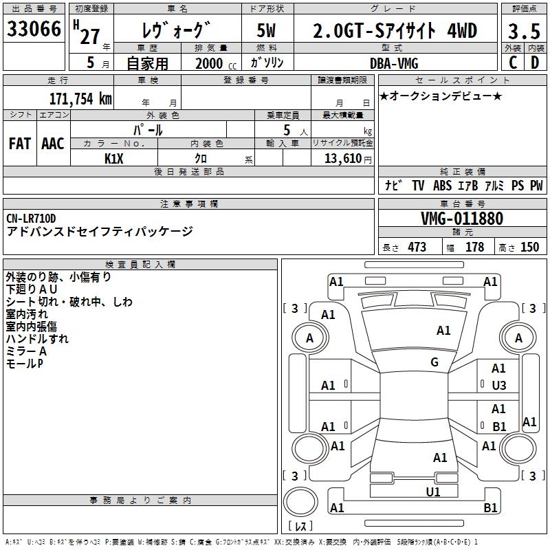 SUBARU LEVORG 2.0GT-S EYESIGHT 4WD - лот 33066