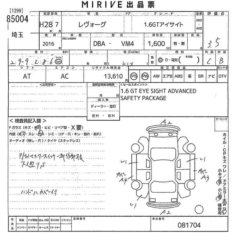 SUBARU LEVORG 1.6GT EYESIGHT - лот 85004