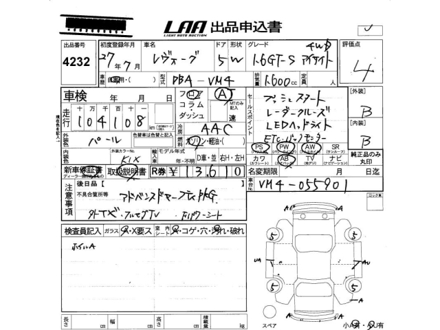 SUBARU LEVORG 1.6GT-S EyeSight 4W - лот 4232