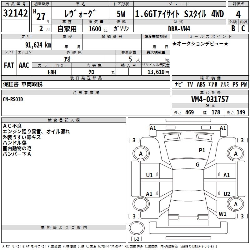 SUBARU LEVORG 1.6GT EYESIGHT S STYLE 4WD - лот 32142