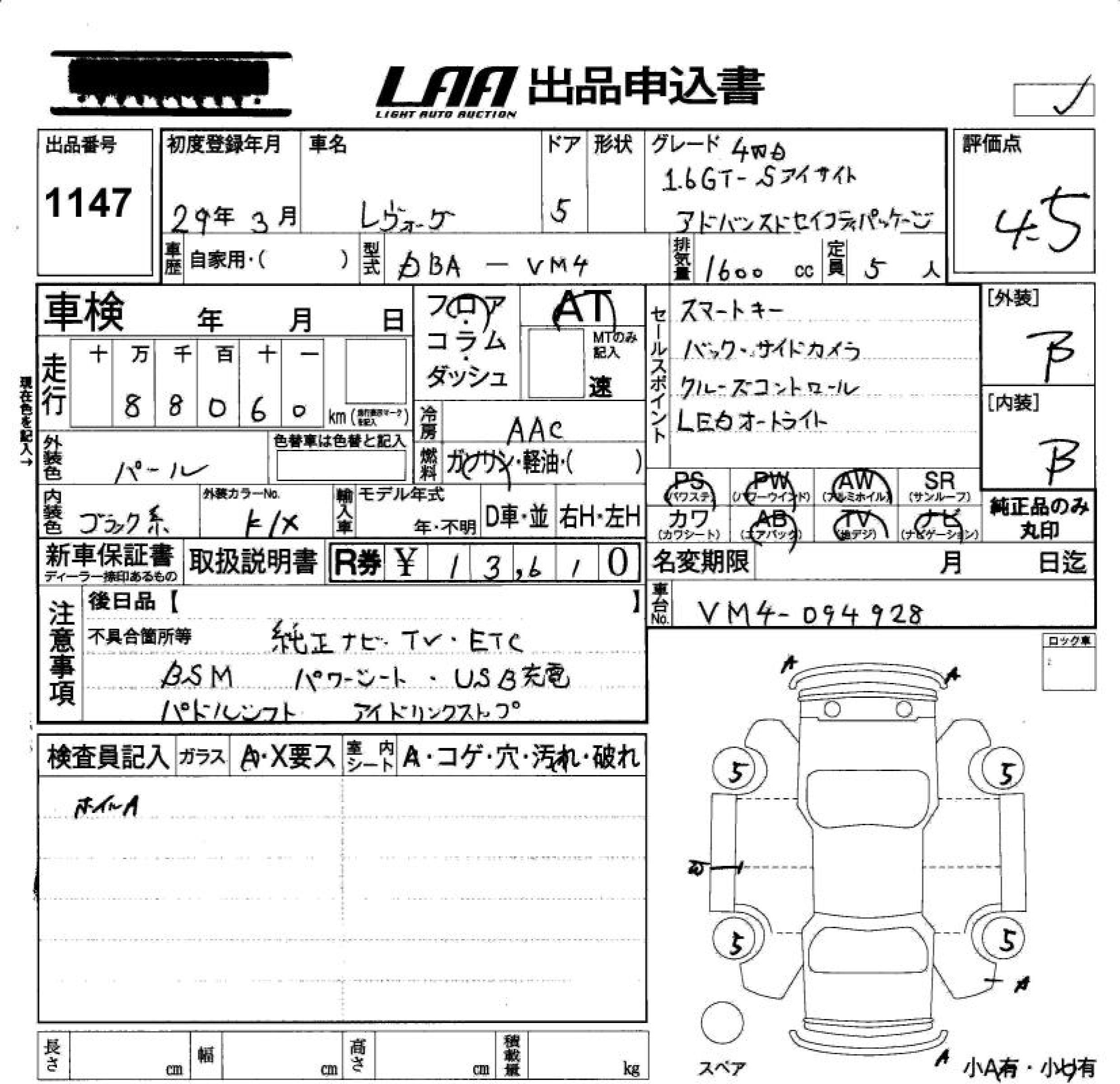 SUBARU LEVORG 1.6GT-S EYESIGHT ADO - лот 1147