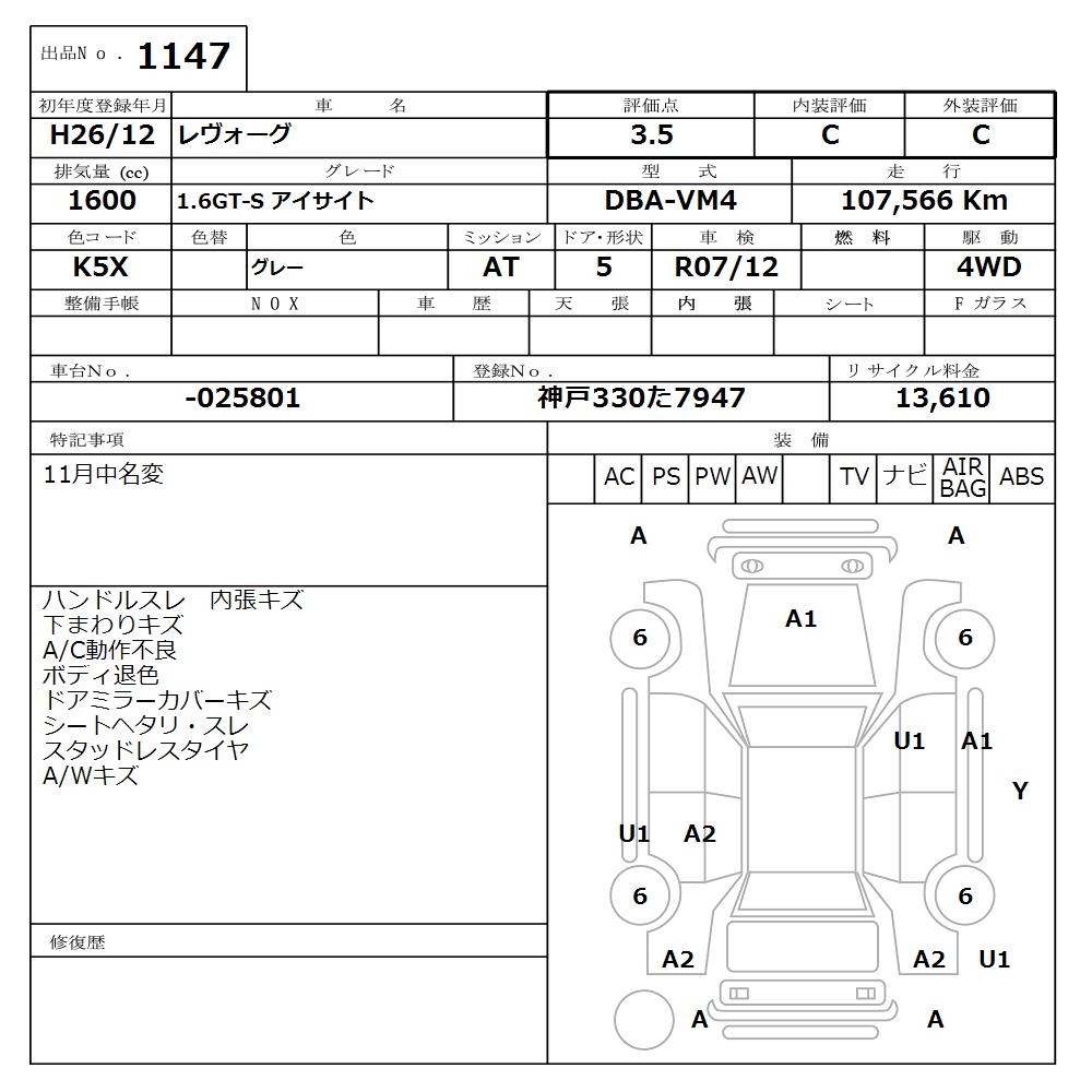 SUBARU LEVORG 1.6GT-S EYESIGHT - лот 1147