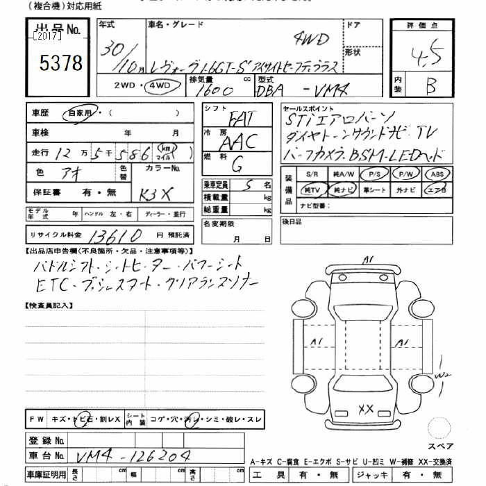SUBARU LEVORG 4WD 1.6GT-S EYESIGHT SAFETY PLUS - лот 5378