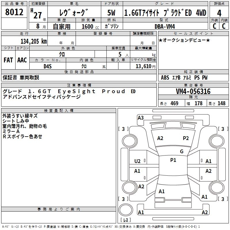 SUBARU LEVORG 1.6GT EYESIGHT PRA UTO4WD - лот 8012