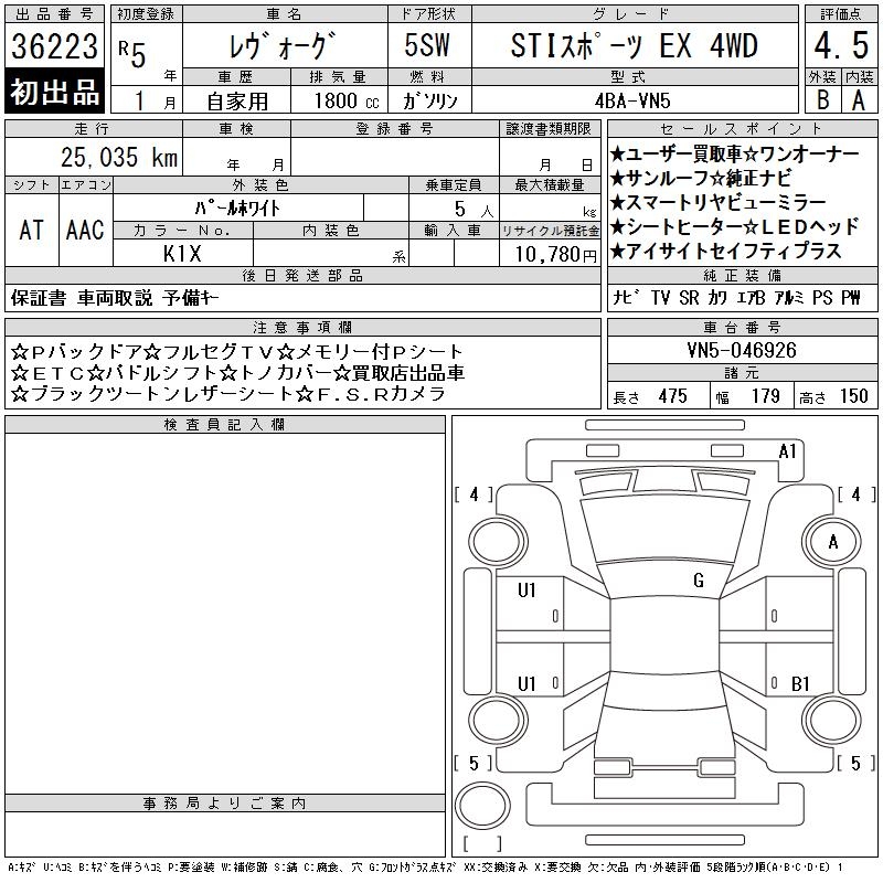 SUBARU LEVORG STI SPORT EX 4WD - лот 36223