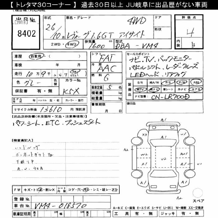 SUBARU LEVORG 4WD 1.6GT EYESIGHT - лот 8402
