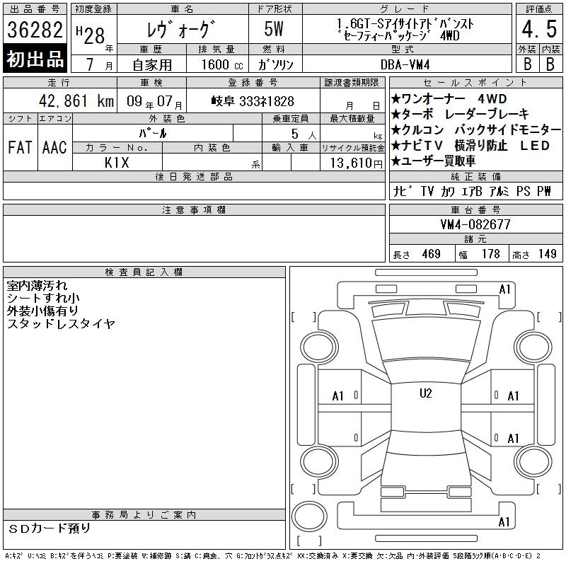 SUBARU LEVORG 16GT-S EYESIGHT ADOBA4WD - лот 36282
