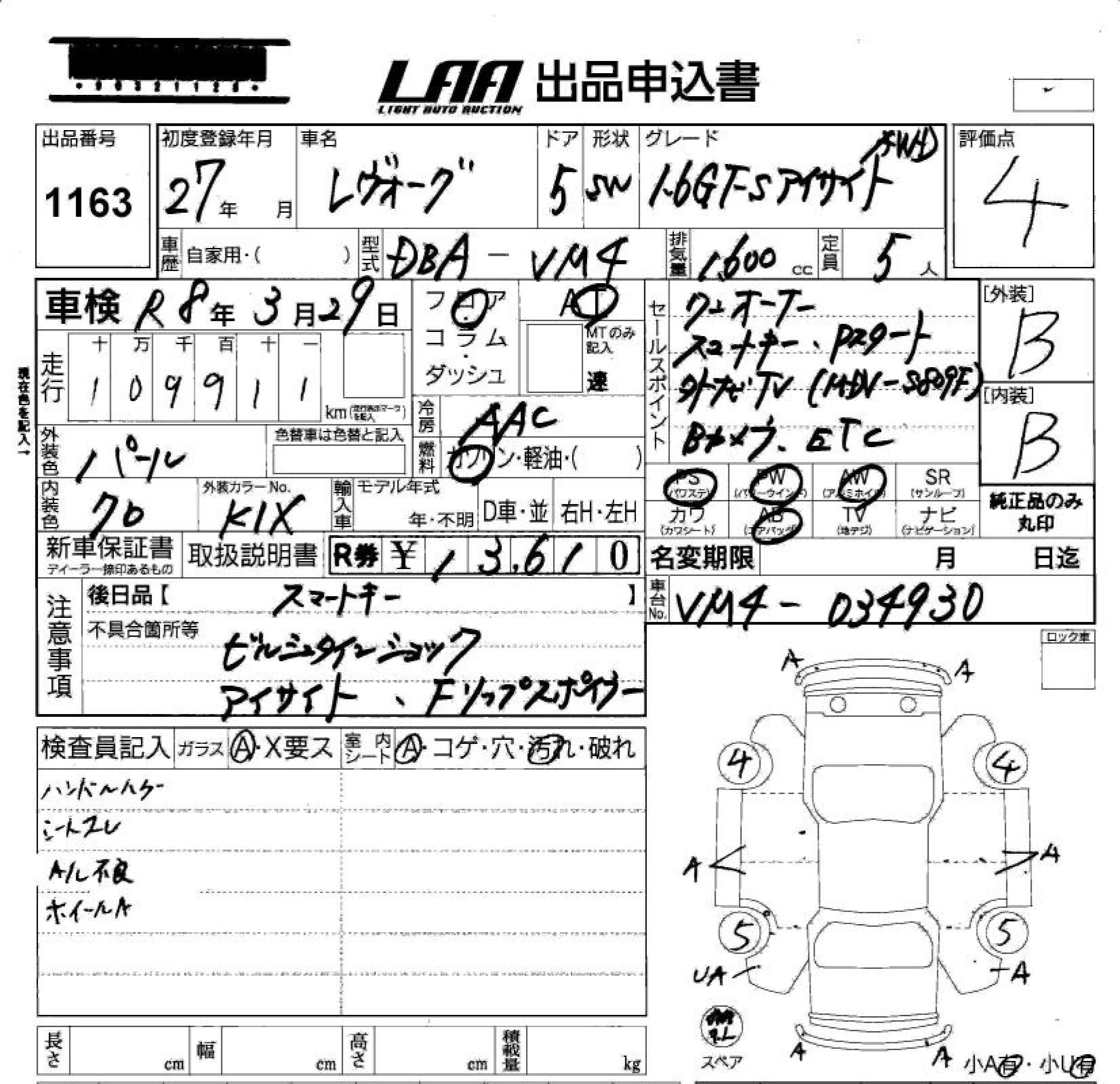 SUBARU LEVORG 1.6GT-S EYESIGHT AW - лот 1163