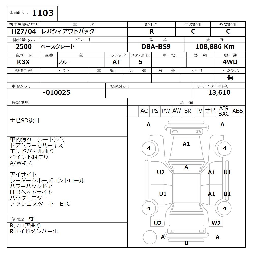 SUBARU OUTBACK BASE GRADE - лот 1103