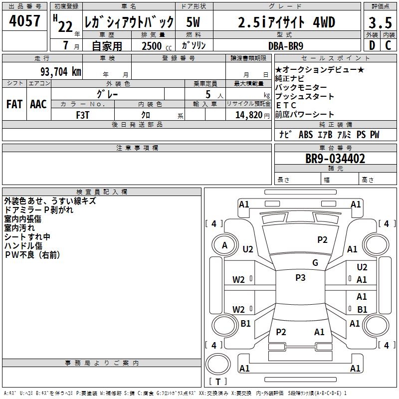 SUBARU OUTBACK 2.5I EYESIGHT 4WD - лот 4057