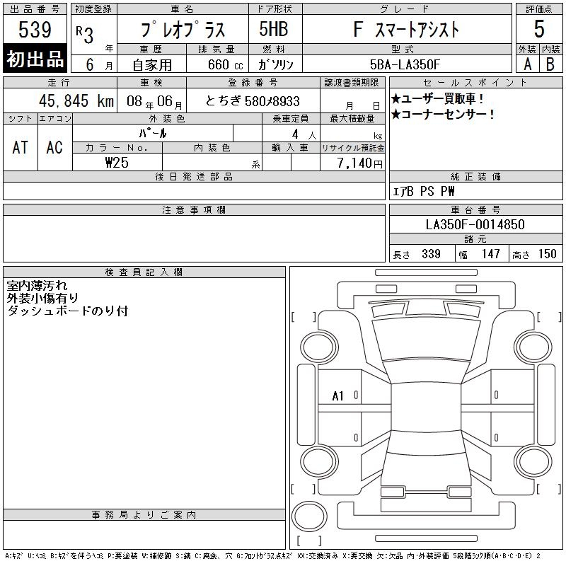SUBARU PLEO PLUS F SMART ASSIST - лот 539