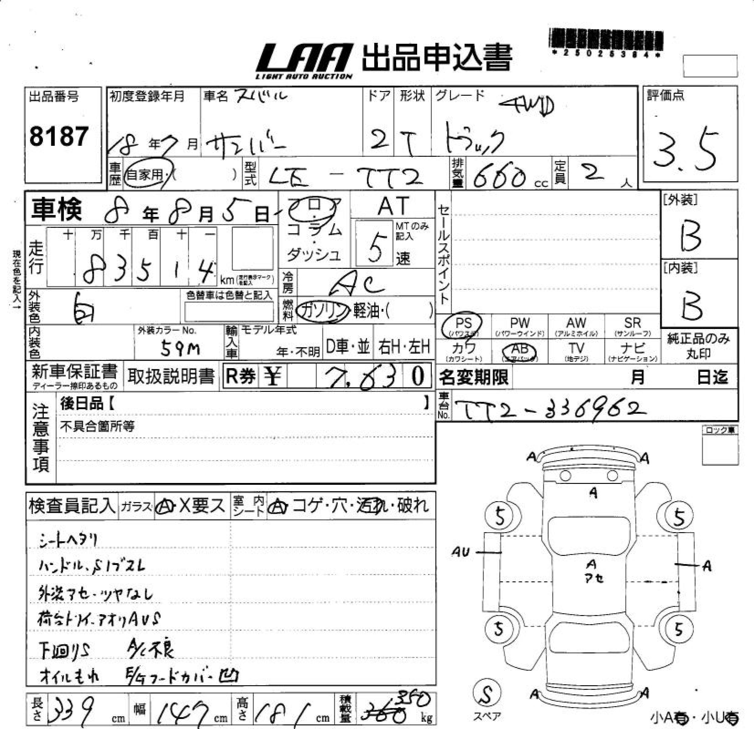 SUBARU SAMBAR TRUCK 4WD - лот 8187