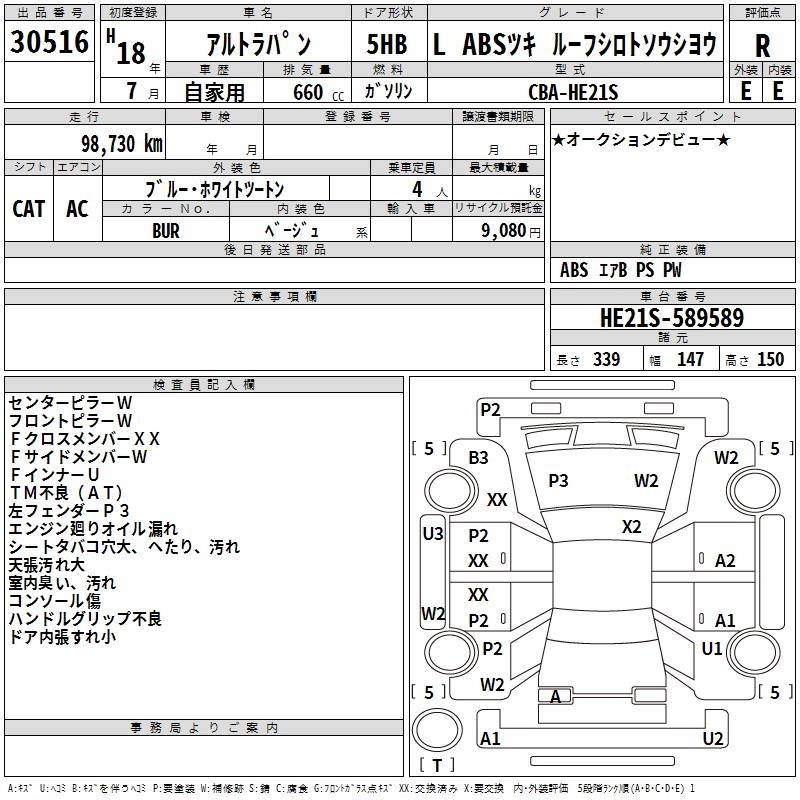 SUZUKI ALTO LAPIN L ABS EXIST ROOF WHITE TOSOU USE - лот 30516