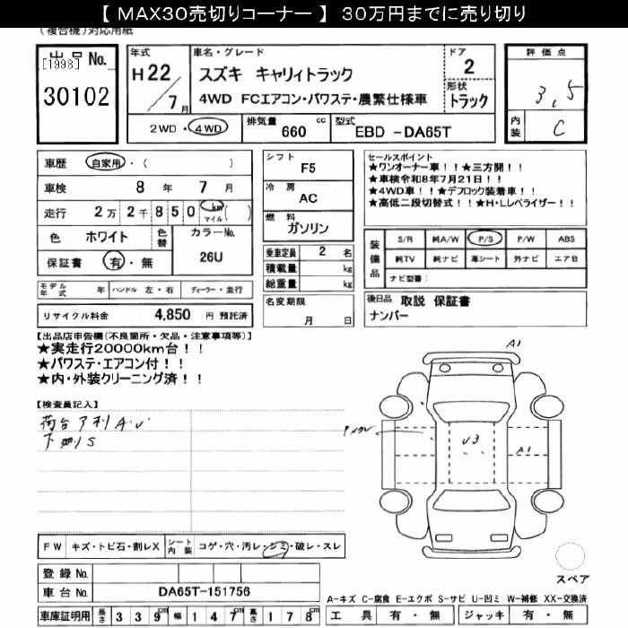 SUZUKI CARRY 4WD FC AIR CONDITIONER POWER STEERING NOUHAN USE CAR - лот 30102