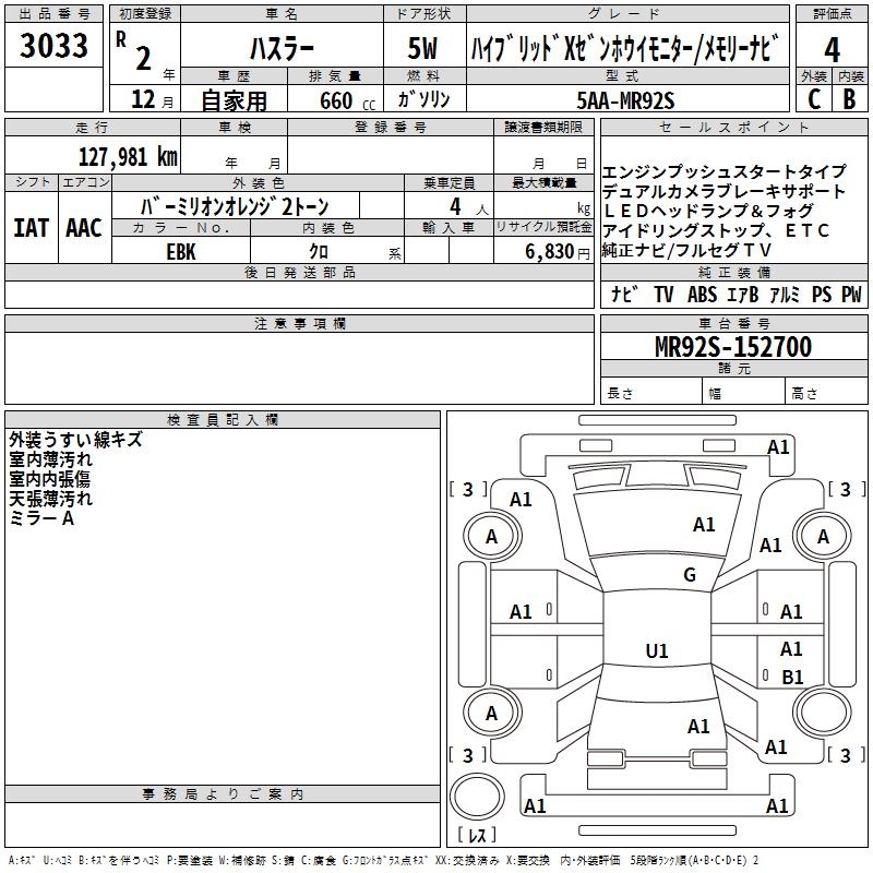 SUZUKI HUSTLER HYBRID XZEN HOWE I MONITOR / - лот 3033