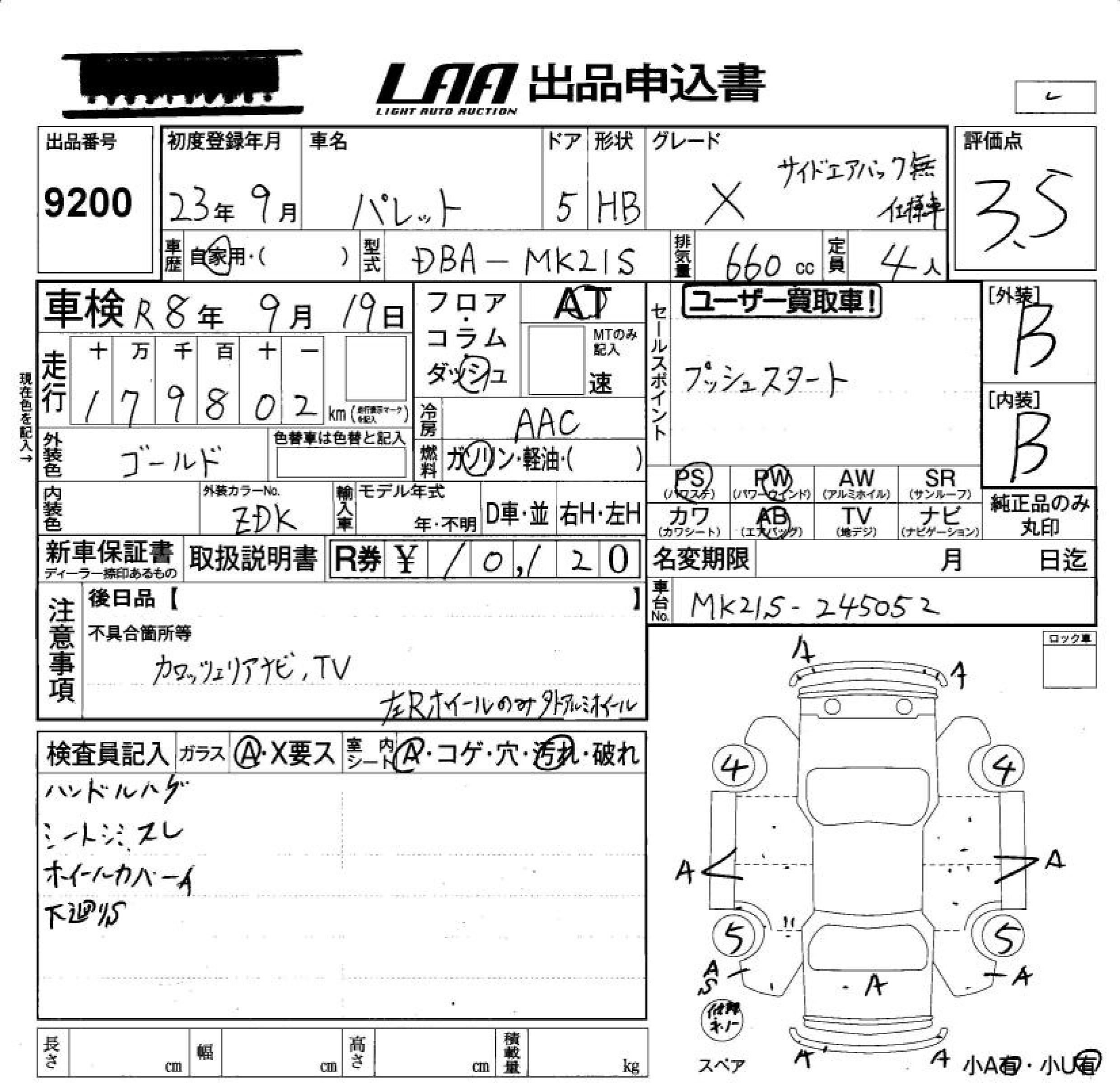 SUZUKI PALETTE X SIDE AIRBAG LESS SPECIFICATION CAR - лот 9200