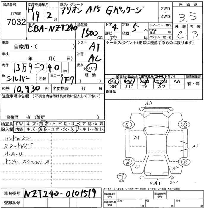 TOYOTA ALLION A15G PACKAGE - лот 7032
