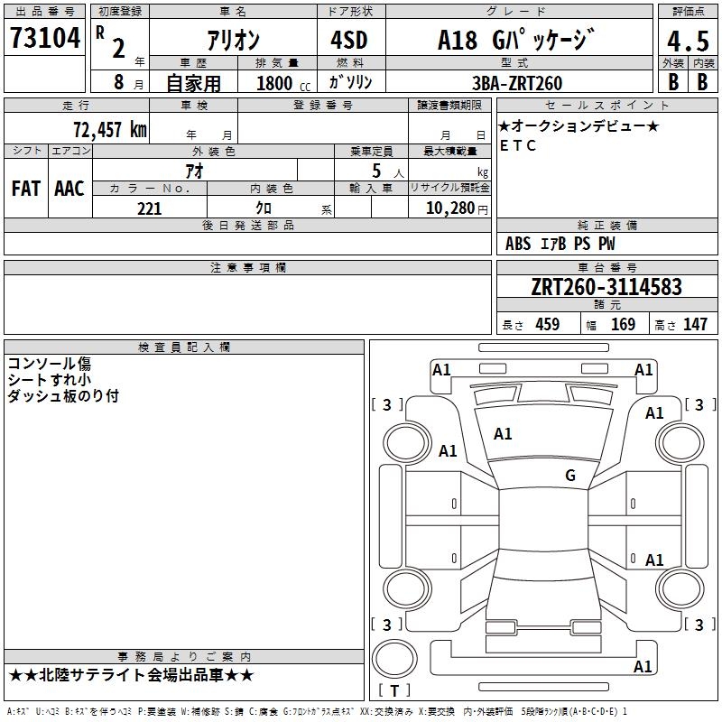 TOYOTA ALLION A18 G PACKAGE - лот 73104
