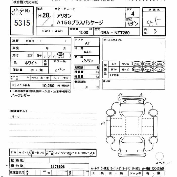TOYOTA ALLION A15G PLUS PKG - лот 5315