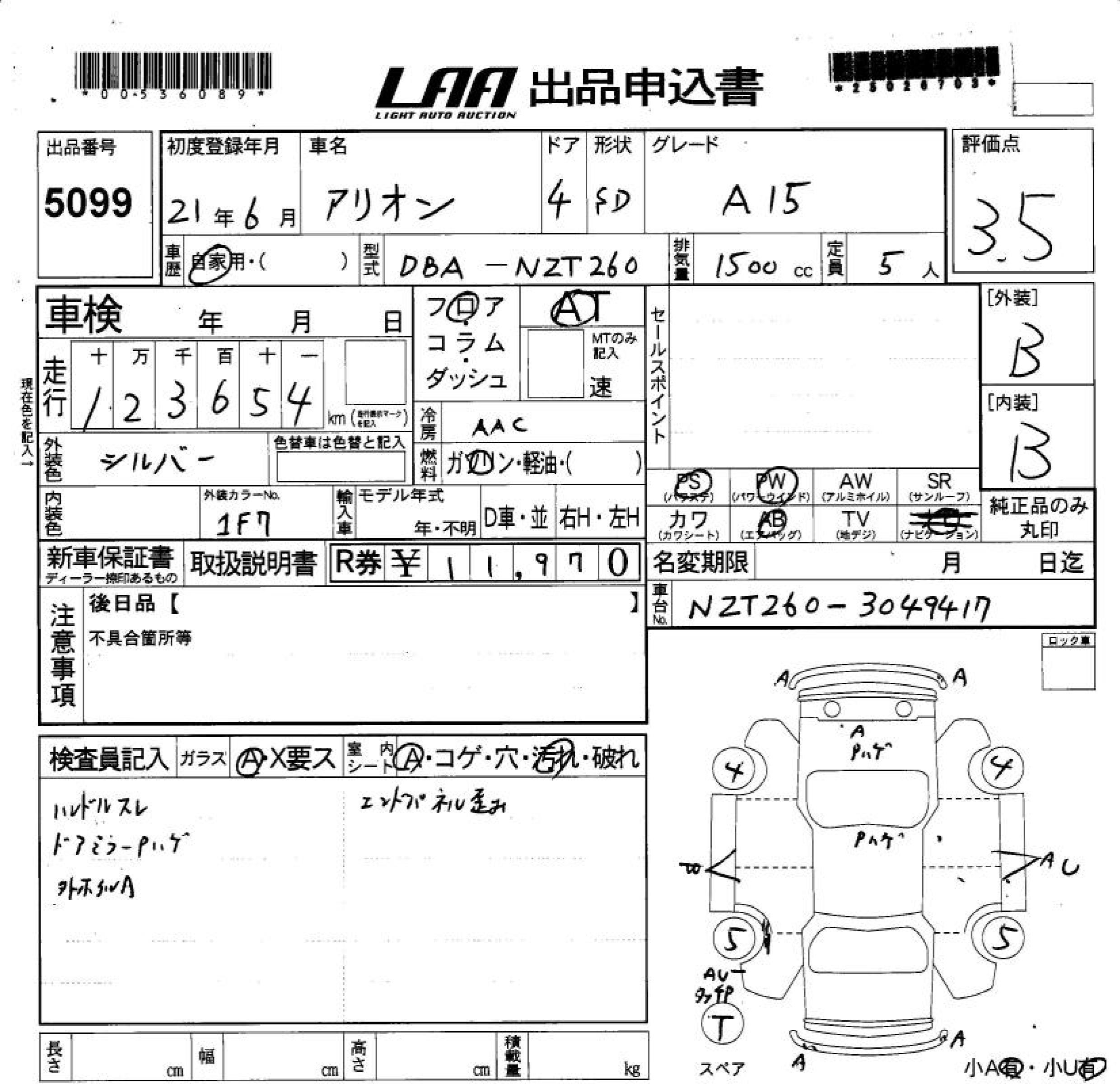 TOYOTA ALLION A15 - лот 5099