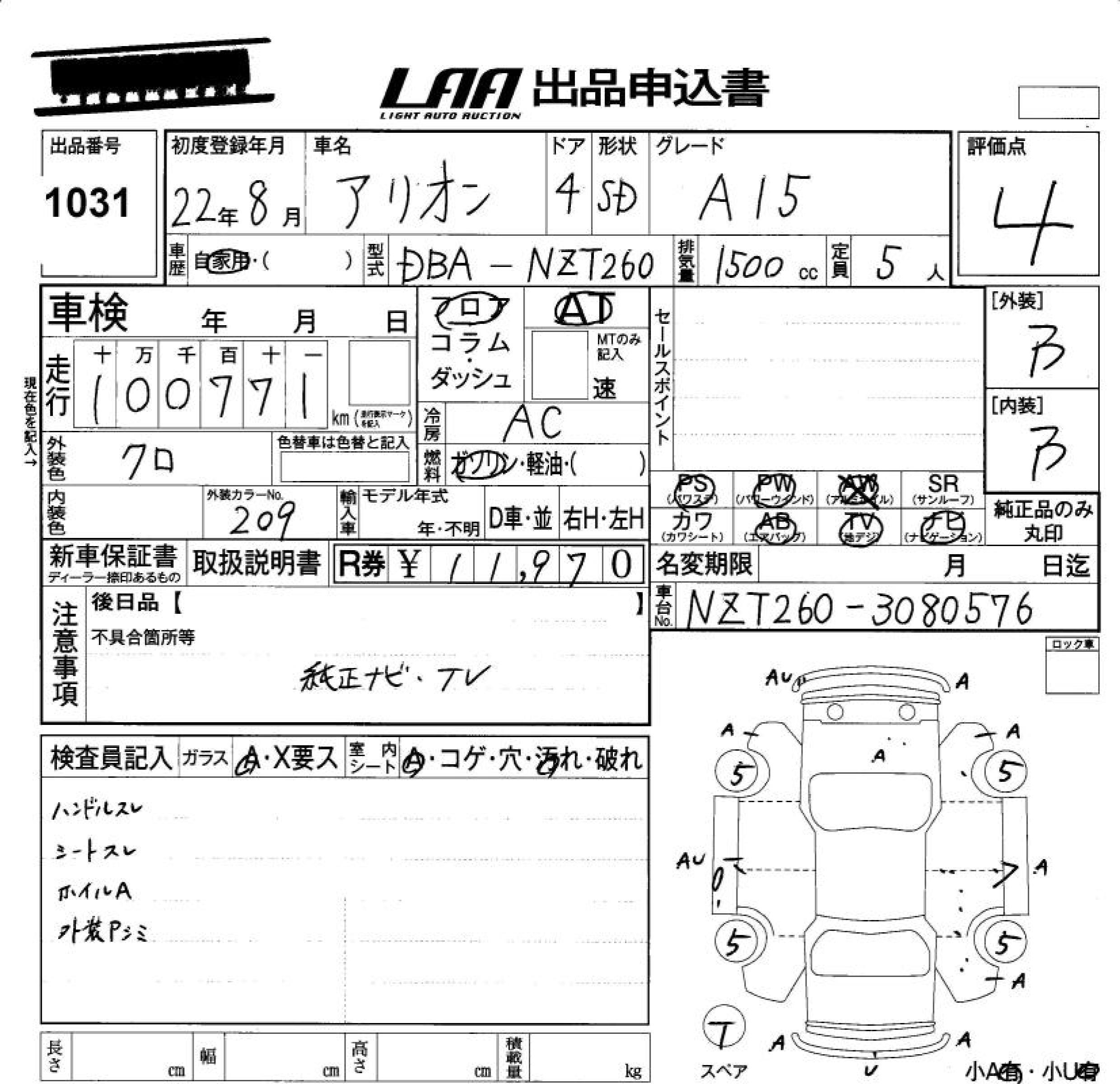 TOYOTA ALLION A15 - лот 1031