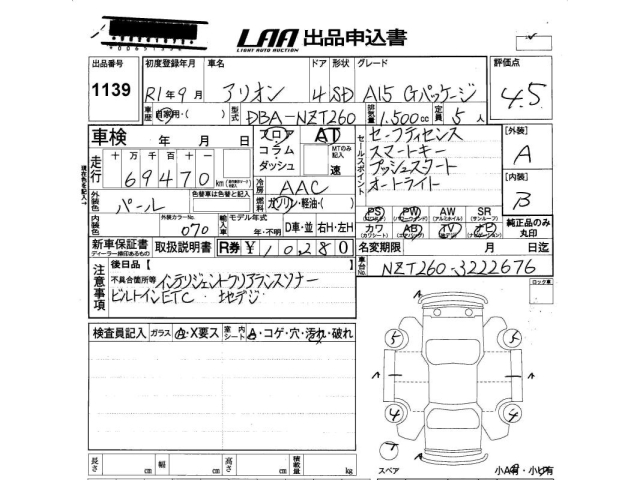 TOYOTA ALLION A15 G package - лот 1139